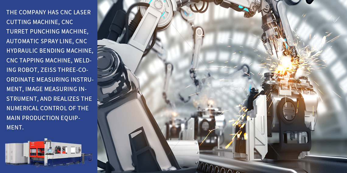 Huge investment has introduced the CNC laser cutting machine of Swiss Baichao Company, CNC turret punching machine of Japan Tiantian Company, CNC hydraulic bending machine, CNC tapping machine, wire drawing machine, leveling machine of Swiss Hymo Company, USA Hag's riveting machine, welding robot of Japan FANUC Corporation, carbon dioxide gas shielded welding machine of Lincoln Company of the United States, three-coordinate measuring instrument of Zeiss Company of Germany and other foreign advanced production equipment and testing equipment.
